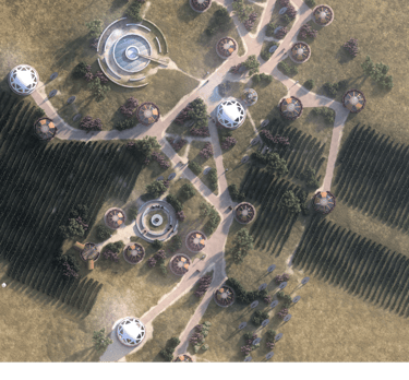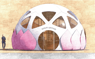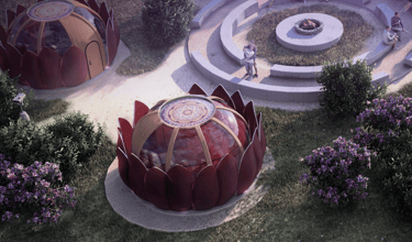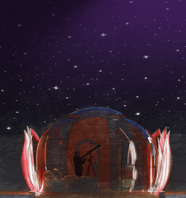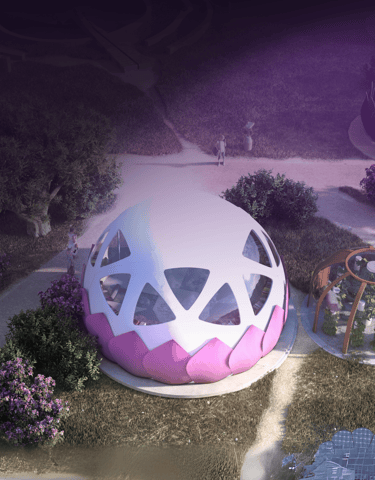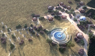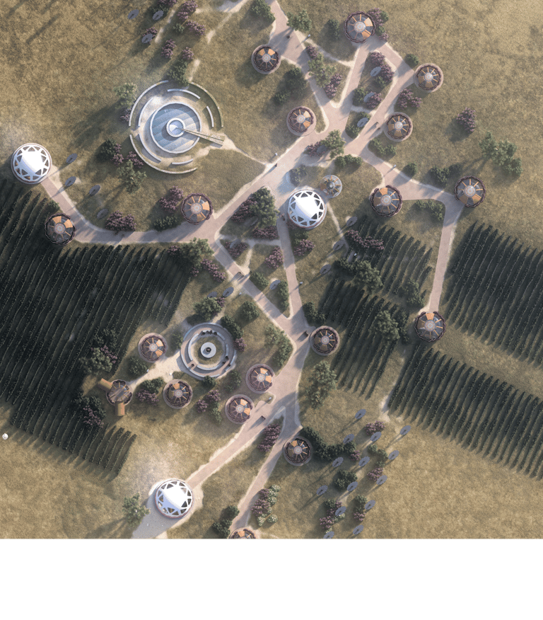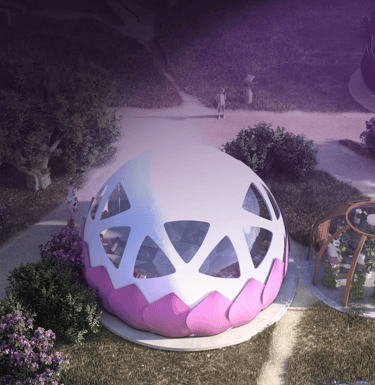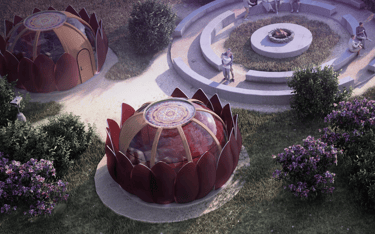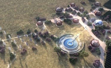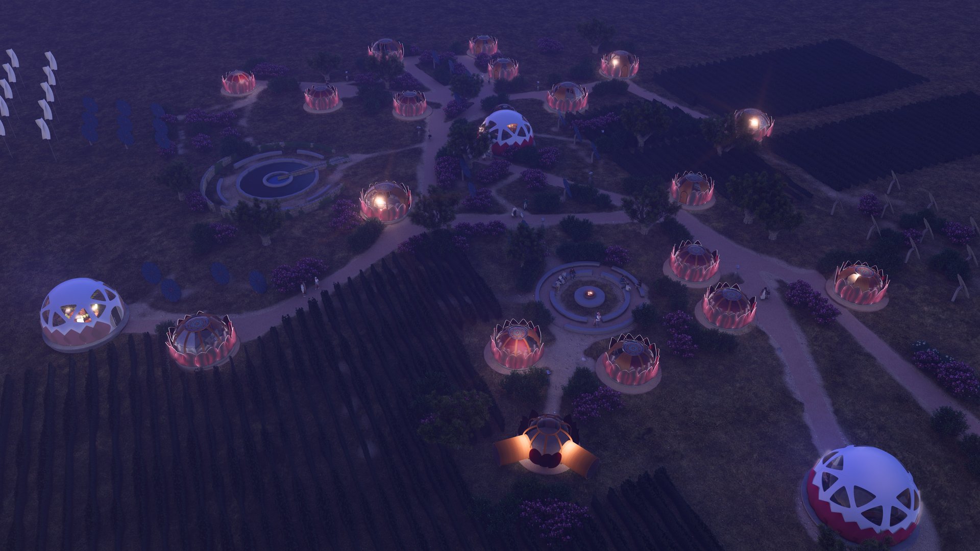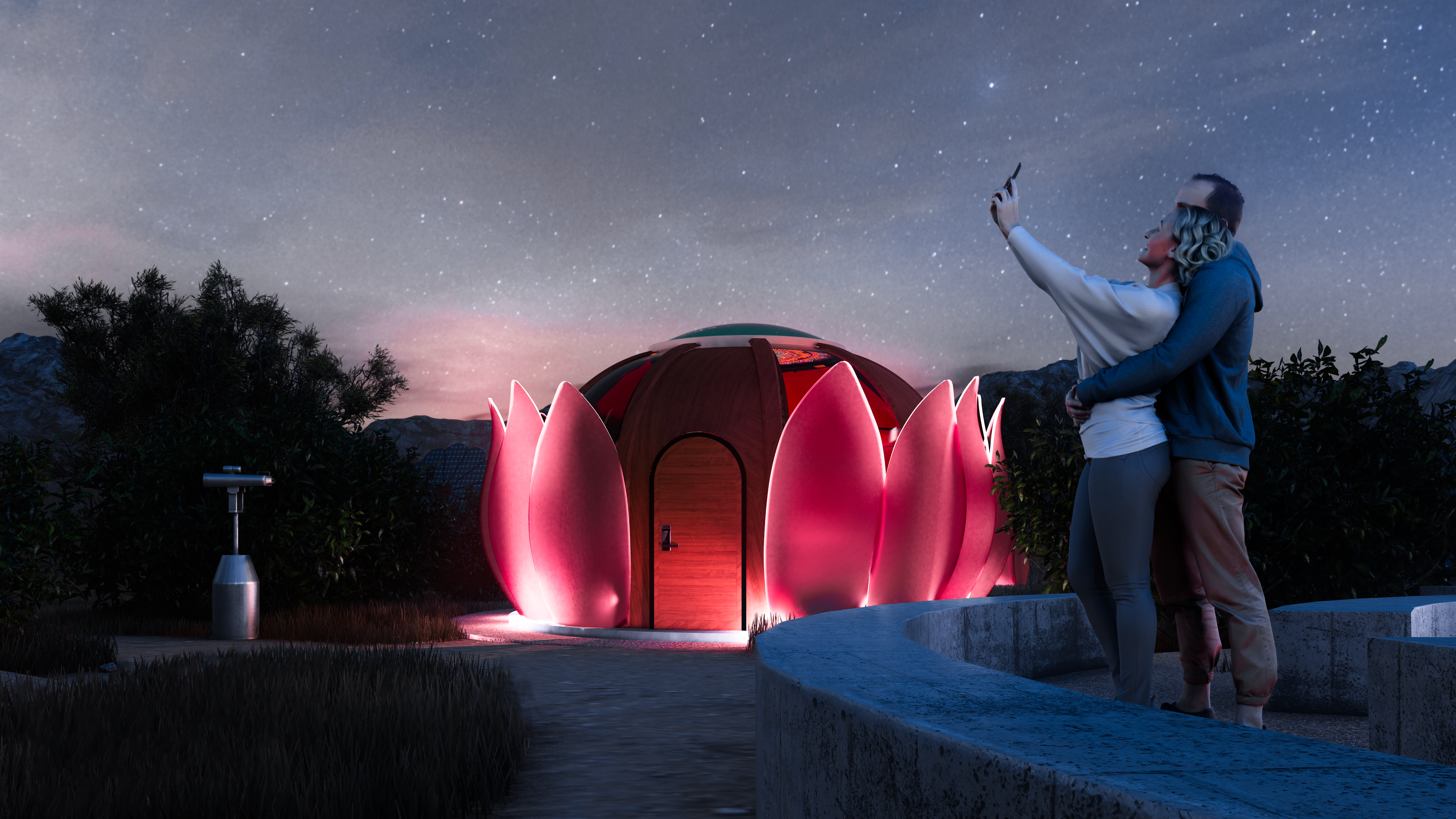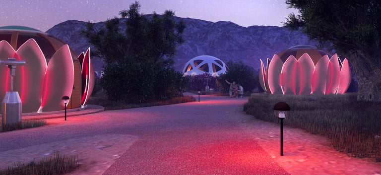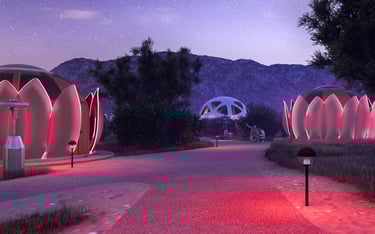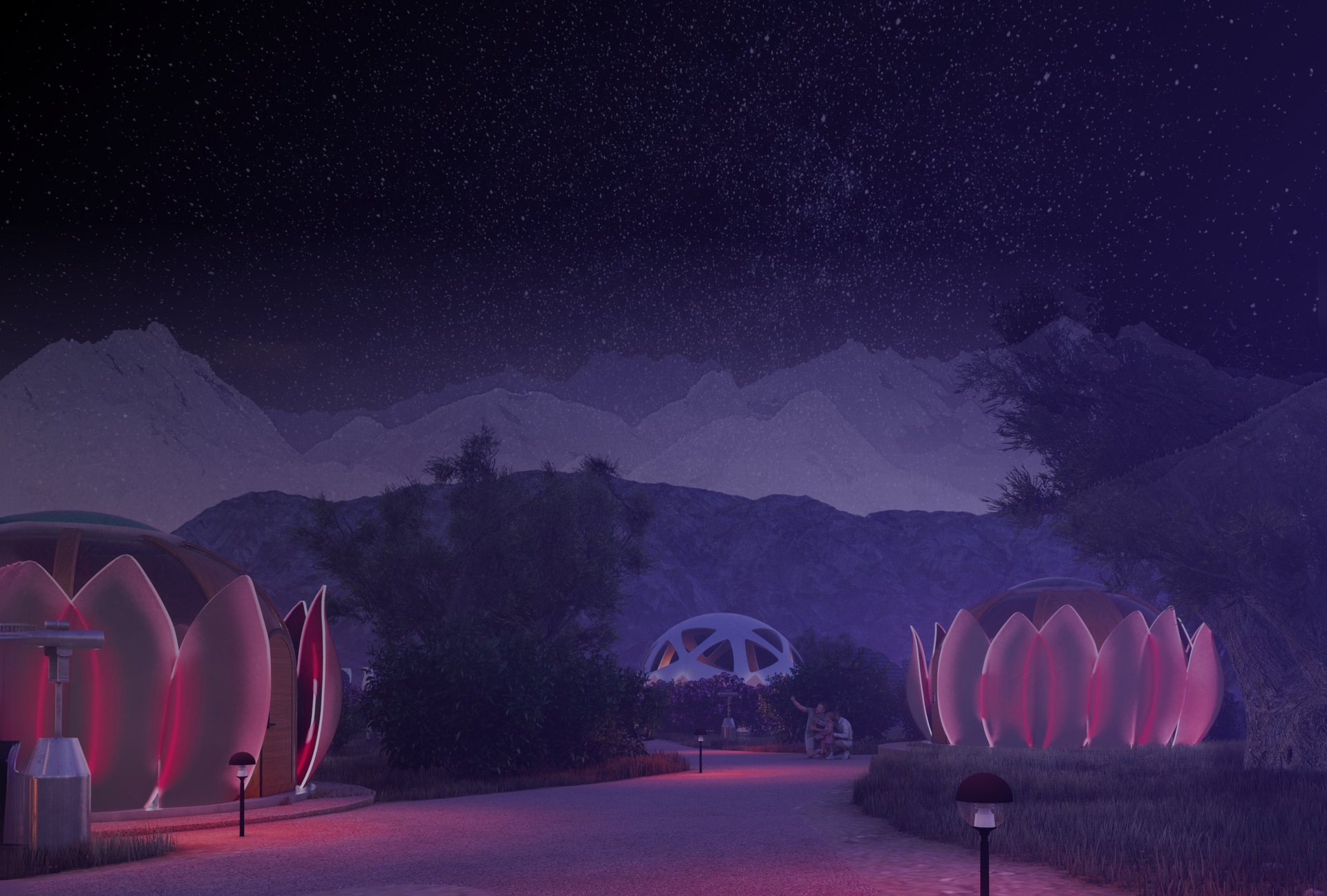Las habitaciones en Celestia son domos construidos con geometría sagrada y techos transparentes que permiten contemplar el cielo nocturno sin salir de la cama.